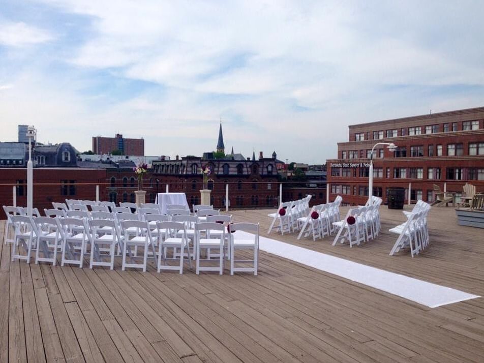 Our splendid rooftop venue offers 8,500 square feet of space and can accommodate up to 200 guests. It offers awe-inspiring views of the harbor and downtown Portland. Meeting space set classroom style.