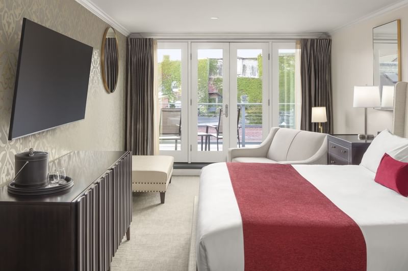 Our 400 sq. ft. Superior King with Deck rooms feature a King bed, private deck with city views, and a twin-sized pullout sofa couch. Enjoy an LCD TV, mini-refrigerator, Keurig® coffeemaker, and renovated bathroom with a magnifying mirror, hair dryer, granite countertops, and glassed-in shower.